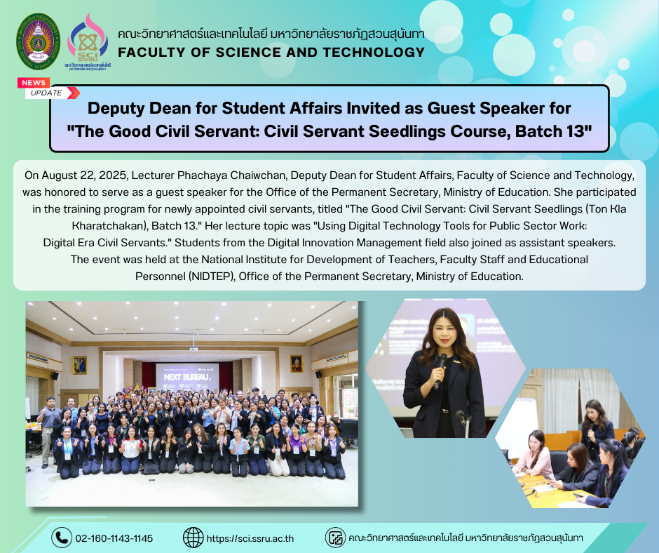 On August 22, 2025, Lecturer Phachaya Chaiwchan, Deputy Dean for Student Affairs, Faculty of Science and Technology, was honored to serve as a guest speaker for the Office of the Permanent Secretary, Ministry of Education. She participated in the training program for newly appointed civil servants, titled "The Good Civil Servant: Civil Servant Seedlings (Ton Kla Kharatchakan), Batch 13." Her lecture topic was "Using Digital Technology Tools for Public Sector Work: Digital Era Civil Servants." Students from the Digital Innovation Management field also joined as assistant speakers. The event was held at the National Institute for Development of Teachers, Faculty Staff and Educational Personnel (NIDTEP), Office of the Permanent Secretary, Ministry of Education.