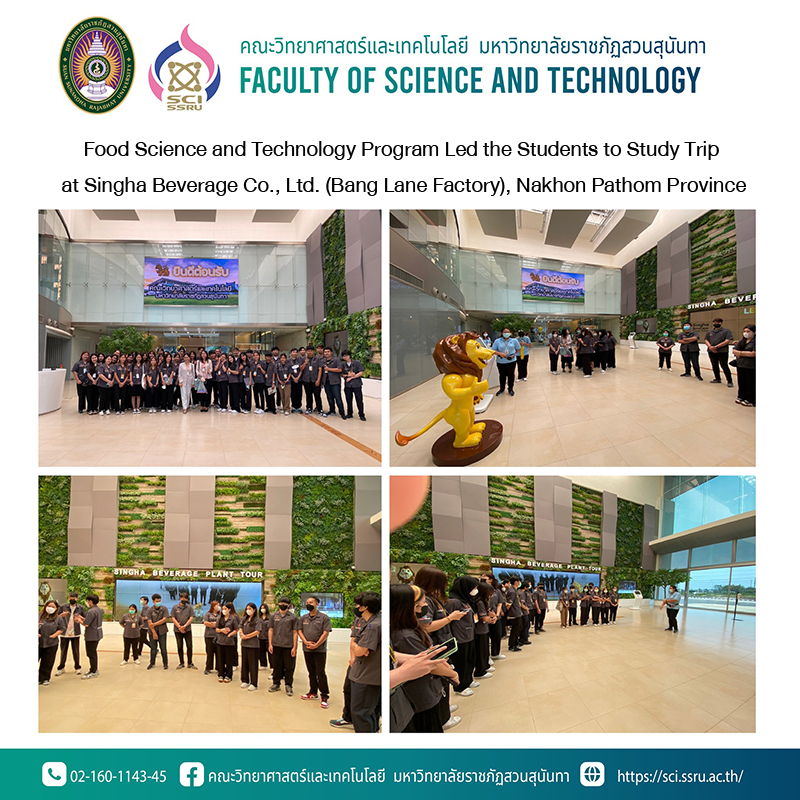 On 21st March 2023 (afternoon period), Food Science and Technology Program, Faculty of Science and Technology, Suan Sunandha Rajabhat University led the students on to study trip at Singha Beverage Co., Ltd. (Bang Lane Factory), Nakhon Pathom province which this trip is continuous project from morning period. This study trip has objective for the students have knowledge improvement about fermented beverages processing, and instrumental in industrial scale.