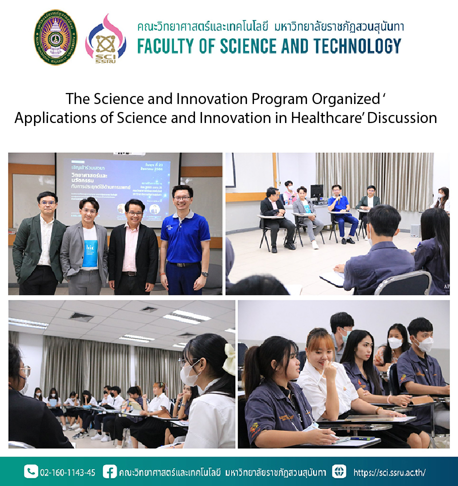 On 23rd August 2023, the Science and Innovation Program, Faculty of Science and Technology, Suan Sunandha Rajabhat University organized ‘Applications of Science and Innovation in Healthcare’ discussion by Dr.Asekha Khantavchai the Head of Applied Mathematics Subprogram, Science and Innovation Program, and their students attended discussion. This discussion has the objective to enable students to have knowledge and understanding and be able to use it as a basis for learning various courses in science and innovation, and to prepare for future careers. This discussion honored Dr.Montri Toso the Senior researcher from Bioplas Co., Ltd., Dr.Puvadol Thammarat the Assistant Director, Wellness Laboratory from National Healthcare Systems Co., Ltd. (N Health), and Dr.Thiersith Nasampan the Chief Research Officer (CRO) from Health Innovation Company at 26501 room, 5th floor, 26 building, Faculty of Science and Technology.