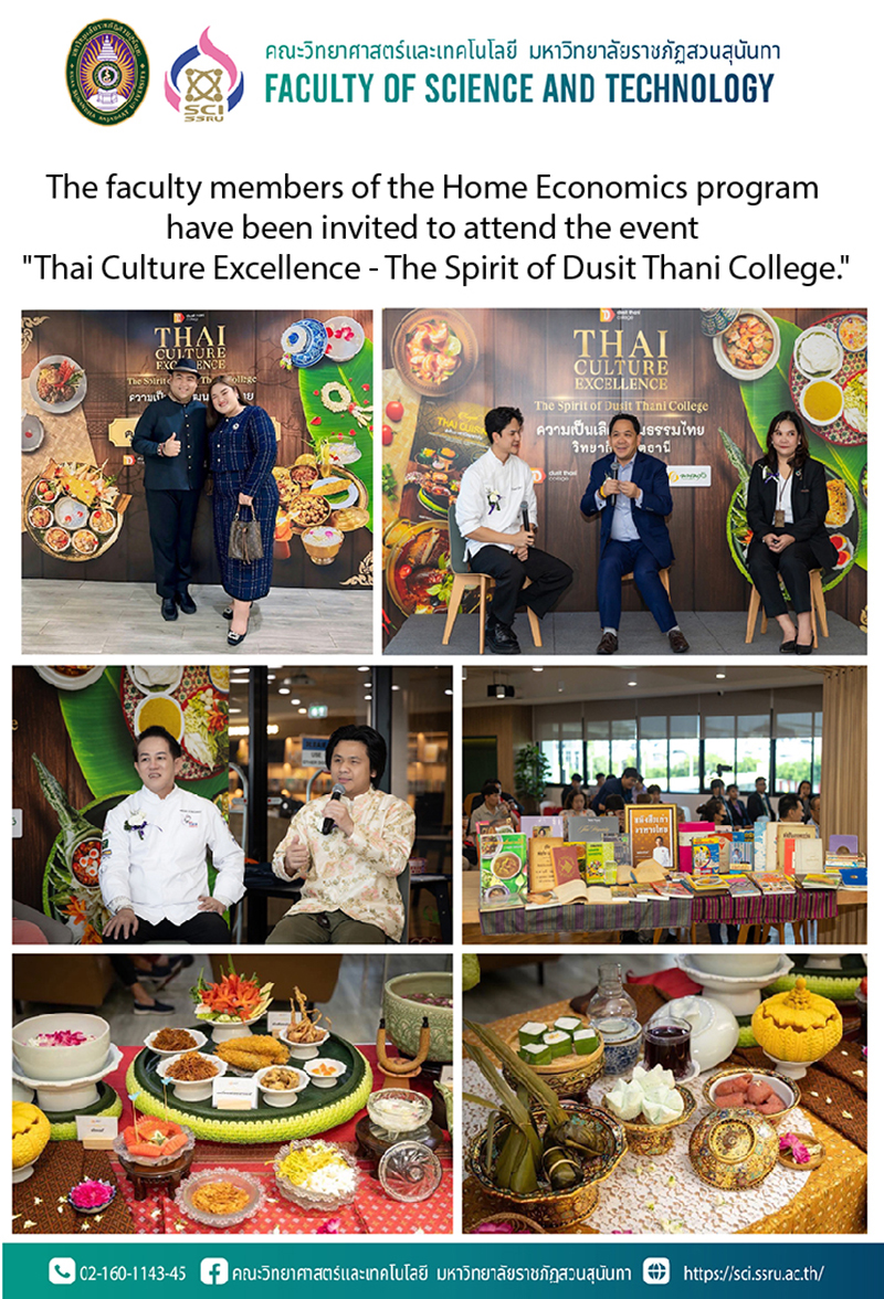On April 25, 2025, Assistant Professor Chutamas Moolwong was invited to participate in the event "Thai Culture Excellence – The Spirit of Dusit Thani College." The event featured a panel discussion on various dimensions of Thai cuisine, with insights from Michelin-starred Thai culinary experts. Attendees had the opportunity to taste “Dusit Thani Signature Thai Cuisine” in a contemporary Thai fusion style, experience the essence of Thai culture, and attend the launch of two books: “Royal Thai Recipes” and “Healthy Living Through Thai Culinary Traditions.” The program also included a special talk on the traditional dish “Khao Chae” led by palace-style Thai food experts and professional chefs, held at the Mahogany Restaurant, Dusit Thani College.