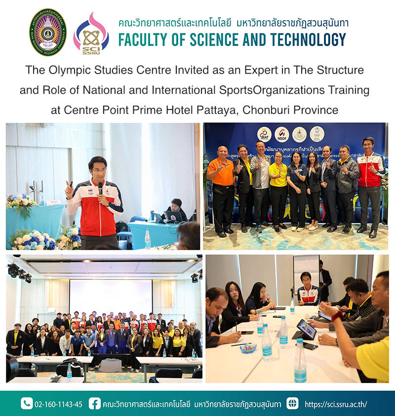 From 24th to 28th June 2024, Assistant Professor Dr.Suriyan Sompong the Director of the Olympic Studies Centre, Faculty of Science and Technology, Suan Sunandha Rajabhat University invited as an Expert for a topic “Olympic Science” in “1st The Structure and Role of National and International Sports Organizations” at Centre Point Prime Hotel Pattaya, Chonburi province organized by Sports Authority of Thailand in collaboration with the Thailand Olympic Academy. This project aims to develop sports personnel of the Sports Association of Thailand to learn about the Olympic strategy, ideology and values, and to apply it in planning work efficiently and sustainably.