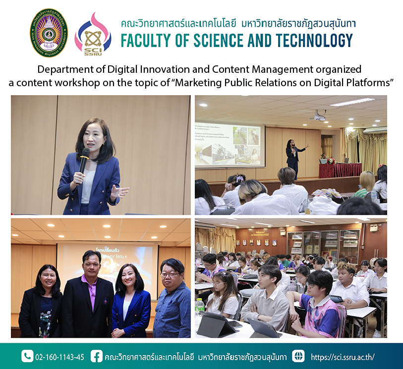 On August 27, 2024, the Department of Digital Innovation and Content Management organized a content workshop on the topic of “Marketing Public Relations on Digital Platforms” to develop students in creating interesting content that meets according to the goal and in line with market trends on digital platforms We were honored by Ms.Methika Thongprasom to provide knowledge this time at meeting room 26103, Faculty of Science and Technology.