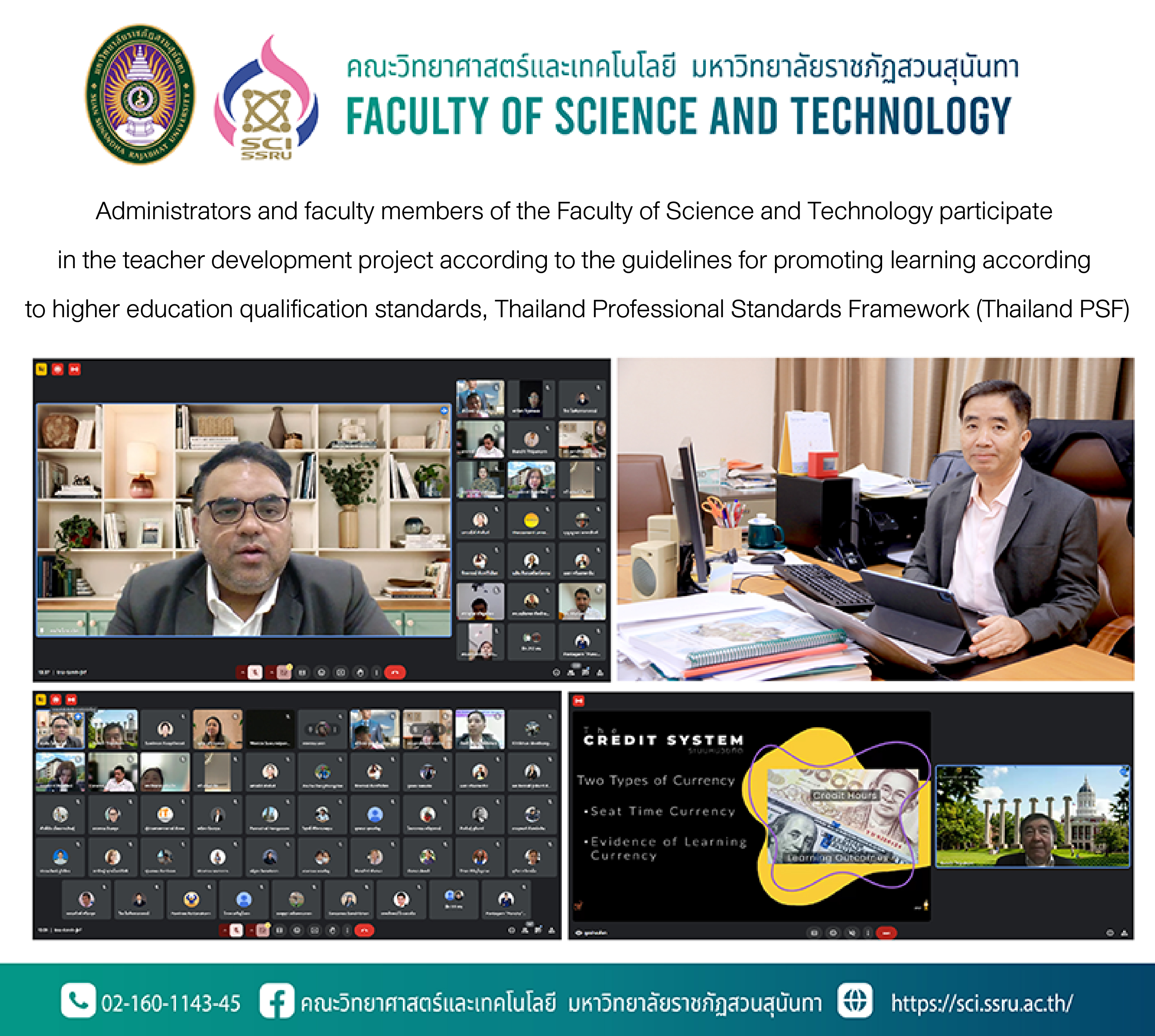 Friday, September 27, 2024 from 1:30 p.m. - 4:30 p.m., led by Associate Professor Dr.Chaisri Tarasawatpipat Dean of the Faculty of Science and Technology along with administrators and faculty Faculty of Science and Technology participate in the teacher development project according to the guidelines for promoting learning according to higher education qualification standards Thailand Professional Standards Framework (Thailand PSF) In an online format through the Google Meet program with Assistant Professor Dr.Khomsan Somanawat, Vice President for Administration. chaired the opening of the project organized by the Human Resources Division Office of the President Suan Sunandha Rajabhat University.