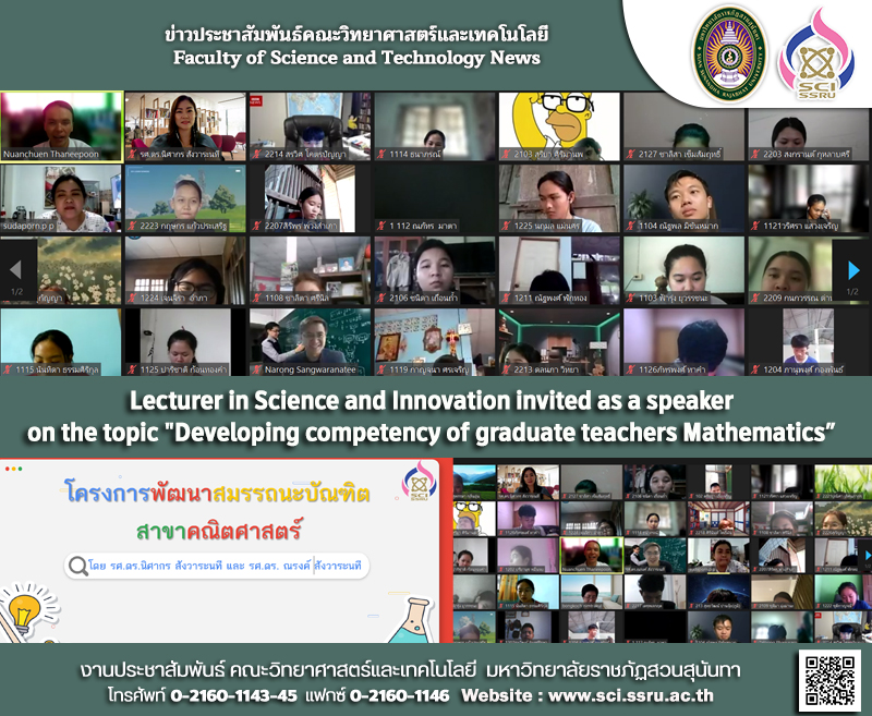 Thursday, March 24, 2022 Associate Professor Dr.Nisakorn Sangwaranatee and Associate Professor Dr.Narong Sangwaranatee, Professors in the Department of Science and Innovation Faculty of Science and Technology was invited as a speaker for mathematics Faculty of Science and Technology Thepsatri Rajabhat University on the topic “Developing Competency of Graduate Teachers Mathematics”.