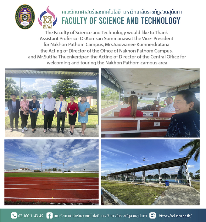 The Faculty of Science and Technology would like to Thank Assistant Professor Dr.Komsan Sommanawat the Vice- President for Nakhon Pathom Campus, Mrs.Saowanee Kumnerdratana the Acting of Director of the Office of Nakhon Pathom Campus, and Mr.Suttha Thuenkerdpan the Acting of Director of the Central Office for welcoming and touring the Nakhon Pathom campus area on 29th September 2023 by Associate Professor Dr.Chaisri Tarasawatpipat the Dean of the Faculty of Science and Technology, Assistant Professor Dr.Talisa Niemmanee the Deputy Dean for Administration, Dr.Sunisa Rachiwong the Head of Sports Science and Health Program, and Mrs.Kamontip Sadtabut the Head Office of Dean attended the touring Nakhon Pathom Campus.