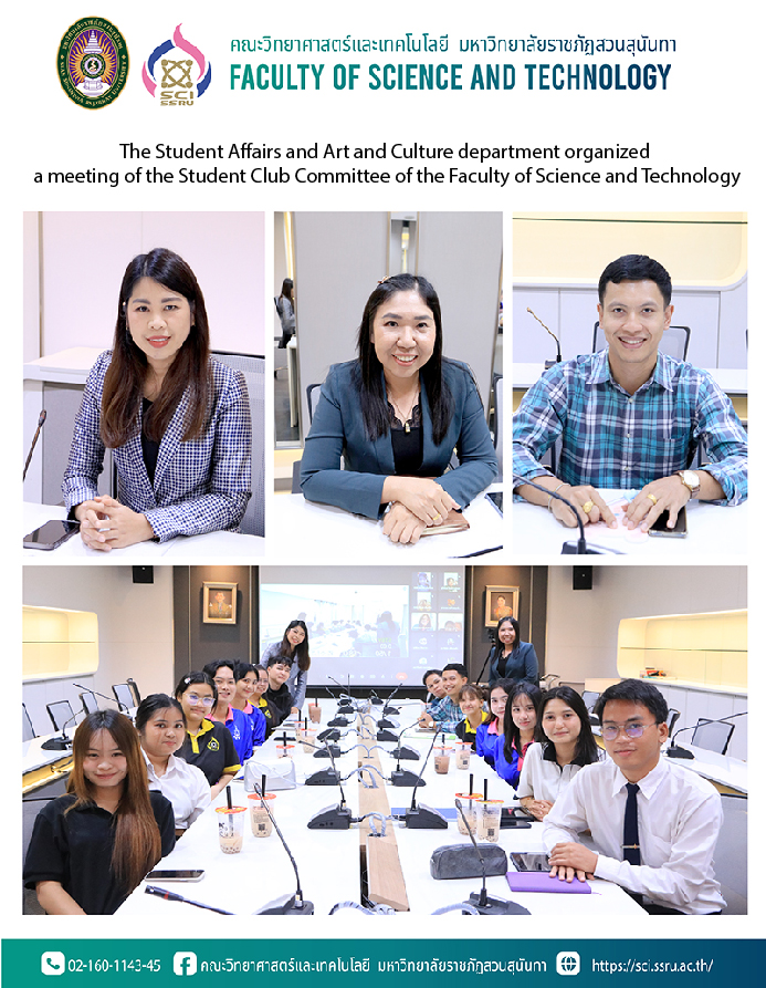 On Thursday, January 30, 2025, the Student Affairs and Art and Culture department of the Faculty of Science and Technology organized a meeting of the Student Club Committee of the Faculty of Science and Technology. The meeting was chaired by Lecturer Phachaya Chiaochan, Deputy Dean for Student Affairs of the Faculty of Science and Technology, to discuss guidelines for developing the student club team and organizing activities in a systematic manner, in line with and supporting the faculty's activities, and developing students to have 21st century learning skills. The meeting was held in meeting room 26109, Faculty of Science and Technology, and online via Google Meet.