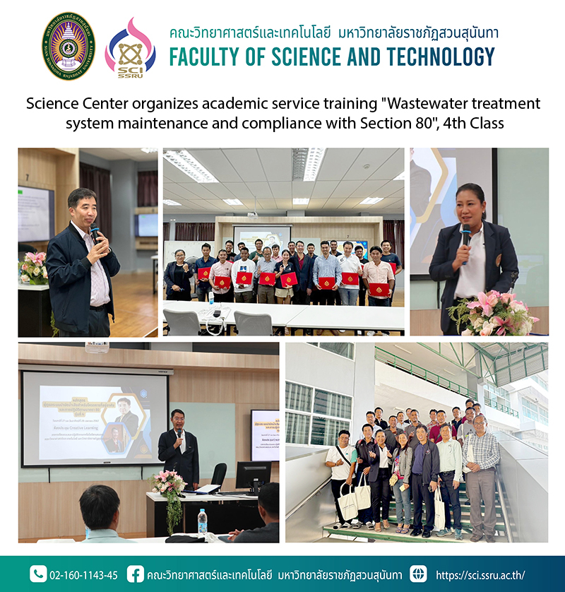 On Saturday the 27th and Sunday the 28th of April 2024, the Science Center Faculty of Science and Technology Suan Sunandha Rajabhat University organized an academic service training course "Wastewater treatment system maintenance for residential projects and compliance with Section 80", Class 4, at the Creative Learning meeting room, Faculty of Science and Technology. Suratthani Rajabhat University Surat Thani Province By being honored by Assistant Professor Dr.Thalisa Niammanee, Deputy Dean for Administration Faculty of Science and Technology Suan Sunandha Rajabhat University Chaired the opening and closing of the training, with Associate Professor Dr. Chaisri Tarasawatpipat. Dean of the Faculty of Science and Technology Honored to give a lecture on the topic "Wastewater treatment and wastewater treatment system maintenance" Associate Professor Siwaphan Chuin, Lecturer in the Department of Environmental Science and Technology Lecture on the topic "Characteristics of wastewater from residential projects Laws related to wastewater management and preparation of reports according to Section 80" which received great attention from personnel of various hotels in the area of Surat Thani province and nearby areas.