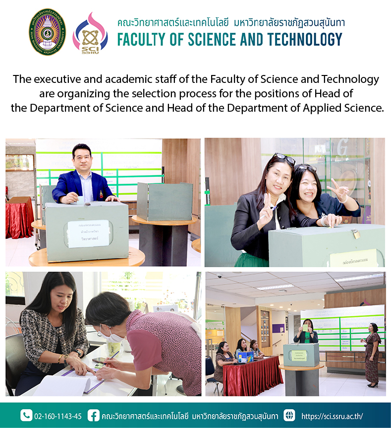 On April 30, 2025, from 1:00 PM to 3:00 PM, Assistant Professor Dr. Chinawat Sassananan, Dean of the Faculty of Science and Technology, along with the Associate Deans, Head of the Office, and faculty members, will participate in the selection process for the Head of the Department of Science and the Head of the Department of Applied Science. This event will take place in front of the Office, 1st Floor, Building 26, Faculty of Science and Technology.