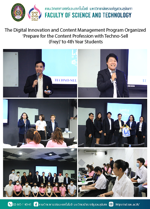 On 30th August 2023 at 1.30 p.m. – 4.00 p.m., the Digital Innovation and Content Management Program, Faculty of Science and Technology, Suan Sunandha Rajabhat University organized ‘Prepare for the Content Profession with Techno-Sell (Frey)’ to 4th year students to enhance skills and creative thinking in content and digital marketing for students to prepare for Field of Professional Experience in management information systems and information studies. This activity was organized at 26108 room, 1st floor, Faculty of Science and Technology, and honored Content Marketing Team and Human Resource staff from Techno - Sell (Frey) Co., Ltd. which is a collaborative company (MoU) with the university.