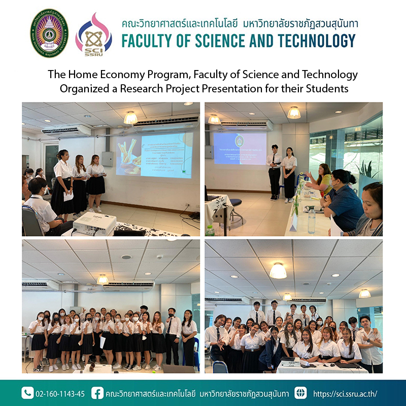 On 27th – 30th March 2023, the Home Economy Program, Faculty of Science and Technology, Suan Sunandha Rajabhat University organized a research project presentation for their students in 01 – 04 sections at 2314 room, 1st floor, Science building (23 building).