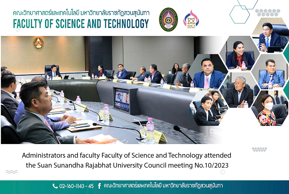 Tuesday, October 31, 2023 at 1:30 p.m., administrators and faculty members of the Faculty of Science and Technology attended the Suan Sunandha Rajabhat University Council meeting No.10/2023, with Associate Professor Dr.Ruedet Kerdwichai, President of the Suan Sunandha Rajabhat University Council chairing the meeting was Associate Professor Dr.Chaisri Tarasawatpipat Dean of the Faculty of Science and Technology (Chairman of the Program) presented improvements to the Doctor of Philosophy curriculum Field of Study: Energy and Environmental Management for Sustainable Green Business