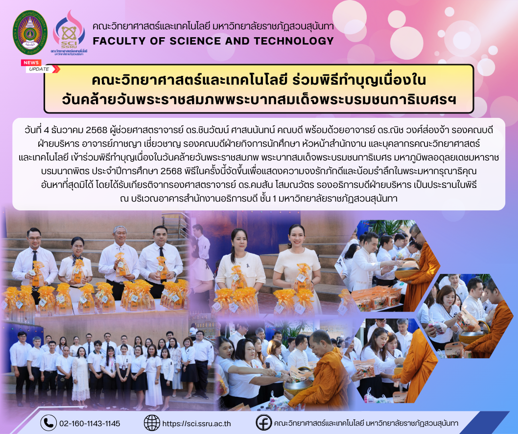 วันที่ 4 ธันวาคม 2568 ผู้ช่วยศาสตราจารย์ ดร.ชินวัฒน์ ศาสนนันทน์ คณบดี พร้อมด้วยอาจารย์ ดร.ณิช วงศ์ส่องจ้า รองคณบดีฝ่ายบริหาร อาจารย์ภาชญา เชี่ยวชาญ รองคณบดีฝ่ายกิจการนักศึกษา หัวหน้าสำนักงาน และบุคลากรคณะวิทยาศาสตร์และเทคโนโลยี เข้าร่วมพิธีทำบุญเนื่องในวันคล้ายวันพระราชสมภพ พระบาทสมเด็จพระบรมชนกาธิเบศร มหาภูมิพลอดุลยเดชมหาราช บรมนาถพิตร ประจำปีการศึกษา 2568 พิธีในครั้งนี้จัดขึ้นเพื่อแสดงความจงรักภักดีและน้อมรำลึกในพระมหากรุณาธิคุณอันหาที่สุดมิได้ โดยได้รับเกียรติจาก รองศาสตราจารย์ ดร.คมสัน โสมณวัตร รองอธิการบดีฝ่ายบริหาร เป็นประธานในพิธี ณ บริเวณอาคารสำนักงานอธิการบดี ชั้น 1 มหาวิทยาลัยราชภัฏสวนสุนันทา