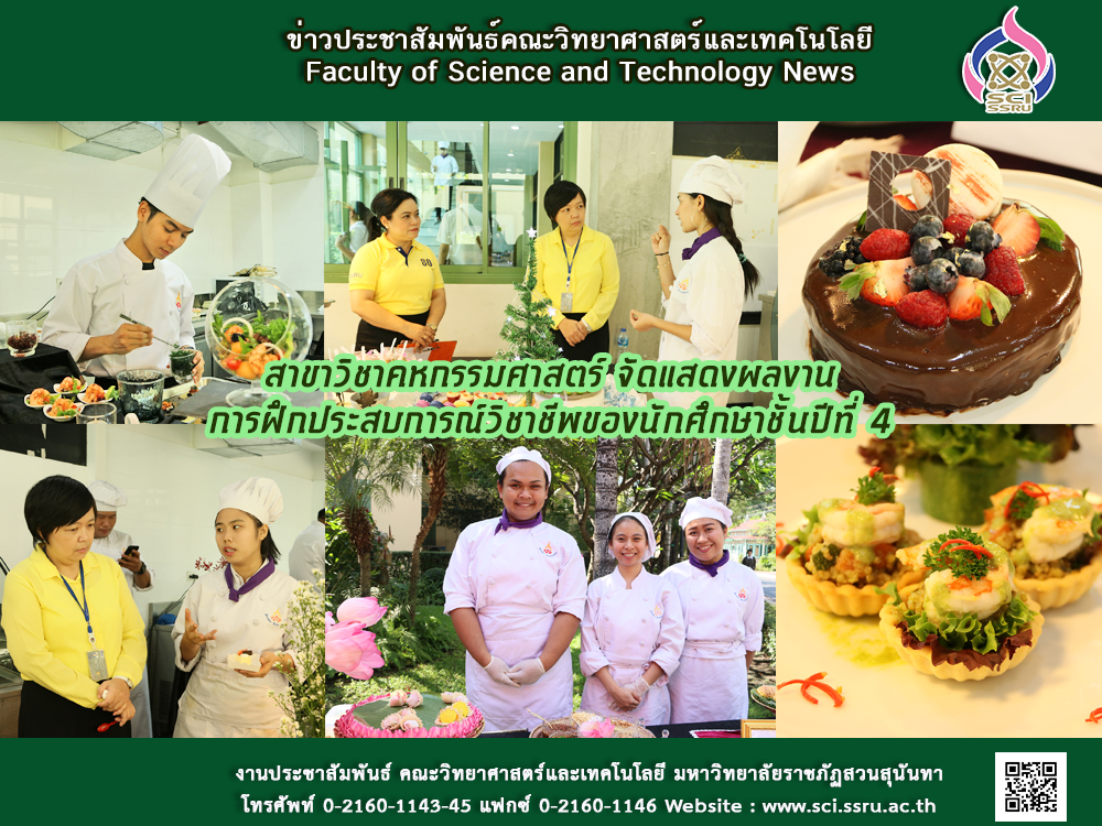 เมื่อวันที่ 4 ธันวาคม 2561 สาขาวิชาคหกรรมศาสตร์ คณะวิทยาศาสตร์และเทคโนโลยี จัดแสดงผลงานการฝึกประสบการณ์วิชาชีพของนักศึกษาชั้นปีที่ 4 ที่ได้เข้ารับการฝึกประสบการณ์วิชาชีพในระหว่างวันที่ 1 สิงหาคม - 30พฤศจิกายน 2561 ทั้งนี้เพื่อให้นักศึกษาได้รายงานการผลฝึกประสบกาณ์ และแสดงผลงานที่ได้รับจากการฝึกประสบการณ์ เพื่อนำมาพัฒนาฝีมือและต่อยอดผลงานในวิชาชีพของตนเองได้ในอนาคต