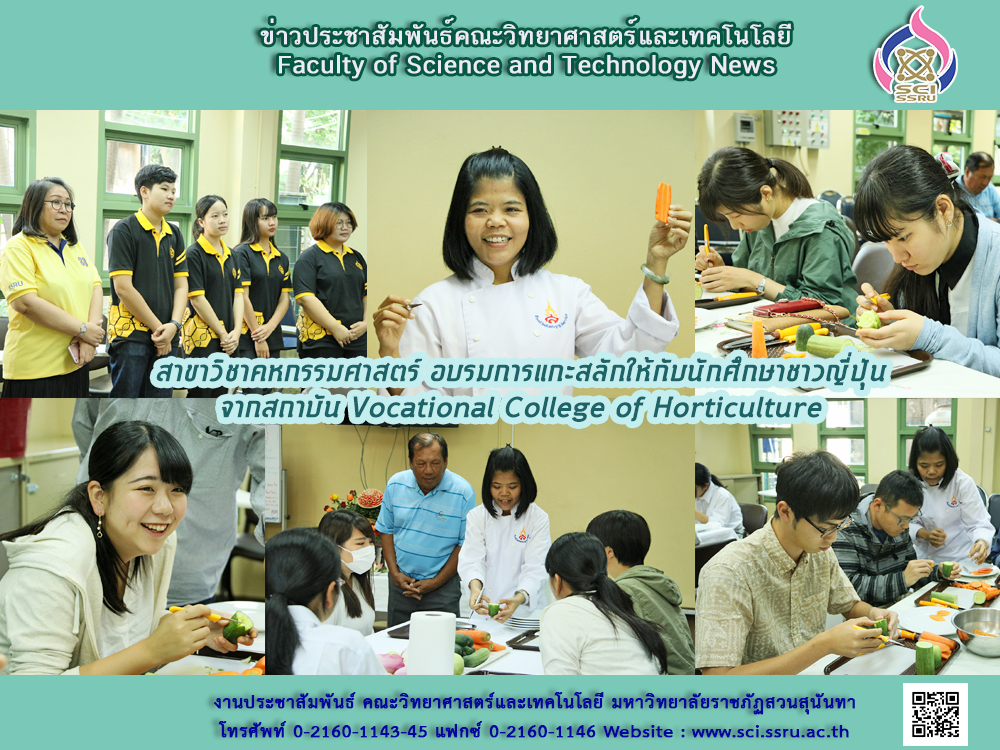 เมื่อวันที่ 4 ธันวาคม 2561  สาขาวิชาคหกรรมศาสตร์ คณะวิทยาศาสตร์และเทคโนโลยี นำโดย อาจารย์นฤมล เปียซื่อ และ อาจารย์จิราพร วีณุตตรานนท์ อาจารย์ประจำสาขาวิชาคหกรรมศาสตร์ ได้ร่วมต้อนรับนักศึกษาชาวญี่ปุ่น จากสถาบัน Vocational College of Horticulture จำนวน 9 คน พร้อมด้วยอาจารย์ชาวญี่ปุ่น 1 คน และตัวแทนผู้ประสานงานชาวไทย ซึ่งได้มีความประสงค์เดินทางมาขอเข้ารับการอบรมการแกะสลักผัก ผลไม้  ทั้งนี้มี อาจารย์จิราพร วีณุตตรานนท์ เป็นผู้สอน