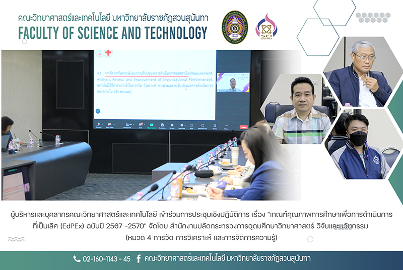 ผู้บริหารและบุคลากรคณะวิทยาศาสตร์และเทคโนโลยี เข้าร่วมการประชุมเชิงปฏิบัติการ เรื่อง "เกณฑ์คุณภาพการศึกษาเพื่อการดำเนินการที่เป็นเลิศ (EdPEx) ฉบับปี 2567 -2570" จัดโดย สำนักงานปลัดกระทรวงการอุดมศึกษาวิทยาศาสตร์ วิจัยและนวัตกรรม (หมวด 4 การวัด การวิเคราะห์ และการจัดการความรู้)