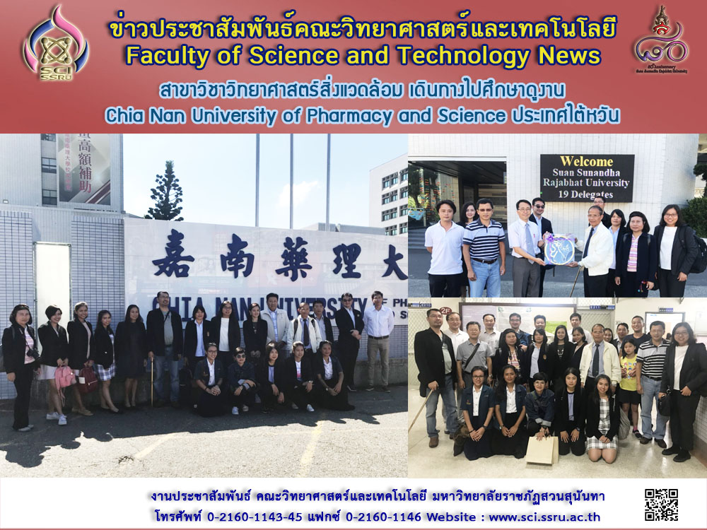 วันที่ 9 กรกฎาคม 2561 คณาจารย์สาขาวิชาวิทยาศาสตร์สิ่งแวดล้อม คณะวิทยาศาสตร์และเทคโนโลยี พร้อมทั้งนักศึกษาหลักสูตรวิทยาศาสตรมหาบัณฑิต สาขาวิชาการจัดการสิ่งแวดล้อม นำทีมโดย รองศาสตราจารย์ ดร.ไพบูลย์ แจ่มพงษ์ รองศาสตราจารย์ศิวพันธุ์ ชูอินทร์ ผู้อำนวยการศูนย์วิทยาศาสตร์ เดินทางไปศึกษาดูงานและเยี่ยมชมห้องปฏิบัติการด้านสิ่งแวดล้อม ณ Chia Nan University of Pharmacy and Science ประเทศไต้หวัน ทั้งนี้ ได้รับการต้อนรับอย่างอบอุ่น จากอธิการบดี Prof. Dr. Hong-Chu Chen คณบดีวิทยาลัยการพัฒนาที่ยั่งยืน Prof. Dr. Meng - Wei Wan และทีมผู้บริหารคณาจารย์ จากภาควิชา Environmental Engineering and Science, Natural Resources Management ทั้งนี้คณาจารย์และนักศึกษา ได้รับความรู้และแลกเปลี่ยนประสบการณ์ร่วมกันด้านการวิจัยด้านสิ่งแวดล้อม แนวทางการพัฒนาหลักสูตรร่วมกัน พร้อมทั้งได้ร่วมนิเทศก์นักศึกษาสาขาวิชาวิทยาศาสตร์สิ่งแวดล้อมที่ได้รับทุนจากคณะวิทยาศาสตร์และเทคโนโลยี เดินทางไปฝึกประสบการณ์วิชาชีพ จำนวน 2 คน คือ นางสาวจิราภรณ์ แสงสร้อย และนางสาวจิตานุช บุญศรี ซึ่งจะฝึกประสบการณ์วิชาชีพถึงวันที่ิ 31 กรกฎาคม พ.ศ. 2561 นี้