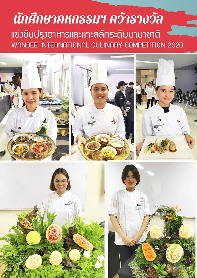 เมื่อวันที่ 7 กุมภาพันธ์ 2563 ที่ผ่านมา นักศึกษาสาขาคหกรรมศาสตร์ คณะวิทยาศาสตร์และเทคโนโลยี มหาวิทยาลัยราชภัฏสวนสุนันทาเข้าร่วมแข่งขันการปรุงอาหารและแกะสลักระดับนานาชาติ WANDE INTERNATIONAL CULINARY COMPETITION 2020 (WICC) ณ วิทยาลัยเทคโนโลยีครัววันดี ซึ่งนักศึกษาสาขาวิชาคหกรรมศาสตร์ได้คว้ารางวัลจากการแข่งขัน ดังกล่าว รายละเอียด ดังนี้