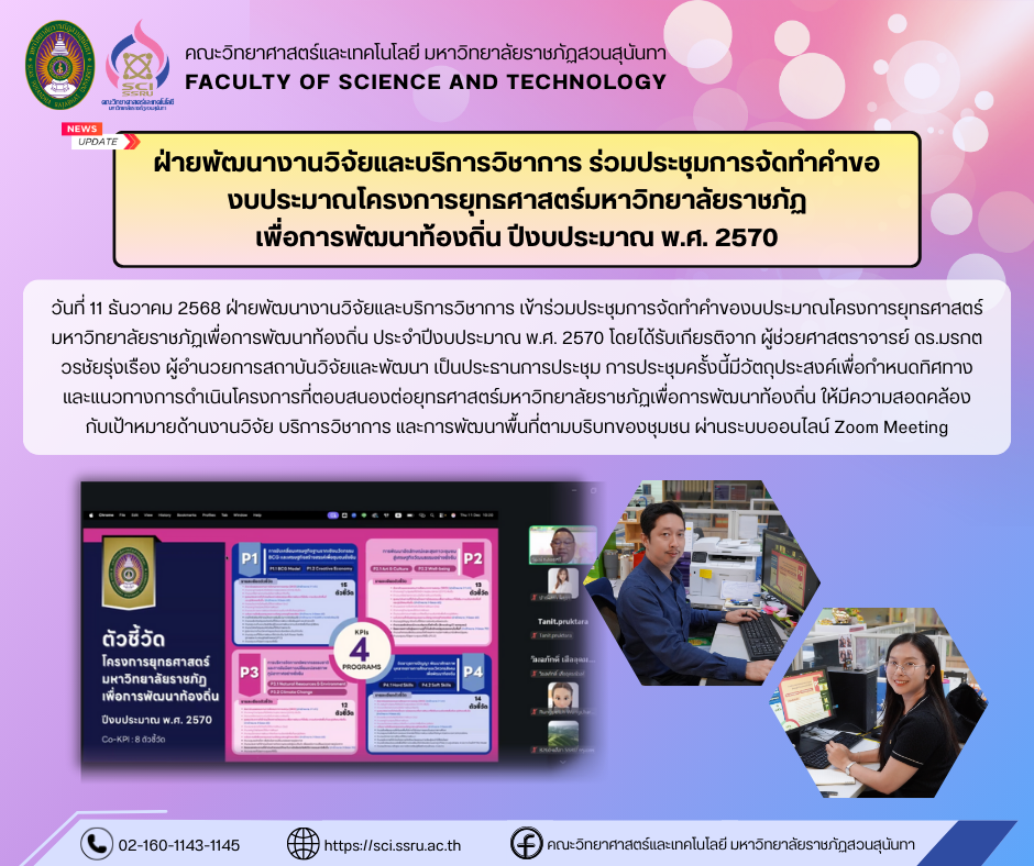 ฝ่ายพัฒนางานวิจัยและบริการวิชาการ ร่วมประชุมการจัดทำคำขอ งบประมาณโครงการยุทธศาสตร์มหาวิทยาลัยราชภัฏ เพื่อการพัฒนาท้องถิ่น ปีงบประมาณ พ.ศ. 2570