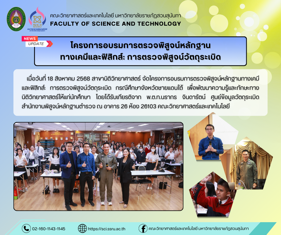 เมื่อวันที่ 18 สิงหาคม 2568 สาขาวิชานิติวิทยาศาสตร์ ได้จัดโครงการอบรมการตรวจพิสูจน์หลักฐานทางเคมีและฟิสิกส์: การตรวจพิสูจน์วัตถุระเบิด กรณีศึกษาจังหวัดชายแดนใต้ โดยได้รับเกียรติจาก พ.ต.ท.นรากร จินดารัตน์ ศูนย์ข้อมูลวัตถุระเบิด สำนักงานพิสูจน์หลักฐานตำรวจ เพื่อพัฒนาความรู้และทักษะทางนิติวิทยาศาสตร์ให้แก่นักศึกษา โดยกิจกรรมนี้ได้จัดขึ้น ณ ห้อง 26103 อาคาร 26 คณะวิทยาศาสตร์และเทคโนโลยี