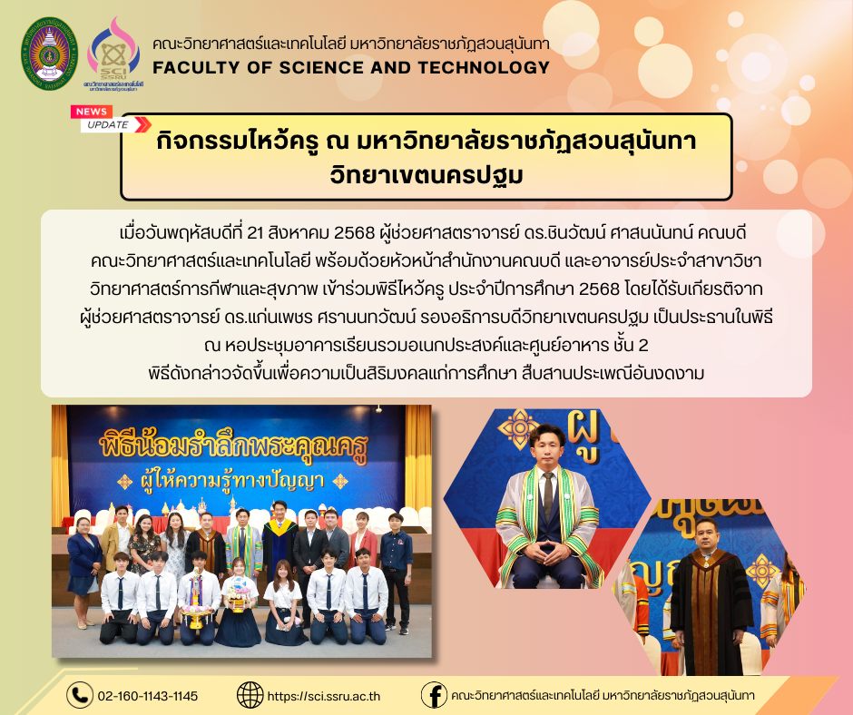 วันพฤหัสบดีที่ 21 สิงหาคม 2568 ผู้ช่วยศาสตราจารย์ ดร.ชินวัฒน์ ศาสนนันทน์ คณบดีคณะวิทยาศาสตร์และเทคโนโลยี พร้อมด้วยหัวหน้าสำนักงานคณบดี และอาจารย์ประจำสาขาวิชาวิทยาศาสตร์การกีฬาและสุขภาพ เข้าร่วมพิธีไหว้ครู ประจำปีการศึกษา 2568 โดยได้รับเกียรติจาก ผู้ช่วยศาสตราจารย์ ดร.แก่นเพชร ศรานนทวัฒน์ รองอธิการบดีวิทยาเขตนครปฐม เป็นประธานในพิธี ณ หอประชุมอาคารเรียนรวมอเนกประสงค์และศูนย์อาหาร ชั้น 2 มหาวิทยาลัยราชภัฏสวนสุนันทา วิทยาเขตนครปฐม พิธีดังกล่าวจัดขึ้นเพื่อความเป็นสิริมงคลแก่การศึกษา สืบสานประเพณีอันงดงาม และแสดงออกถึงความเคารพ ความกตัญญูกตเวทีของศิษย์ที่มีต่อครูอาจารย์ ซึ่งถือเป็นแบบแผนอันดีงามที่สืบทอดกันมาอย่างยาวนาน ท่ามกลางบรรยากาศ อบอวนด้วยความรัก ผูกพันธ์ เคารพ ศิษย์ อาจารย์