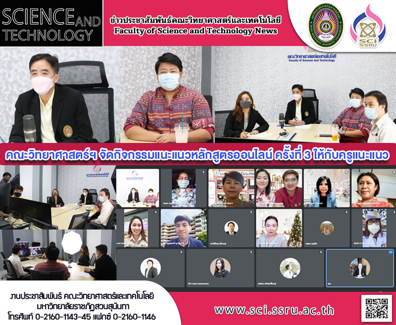 วันจันทร์ที่ 31 มกราคม 2565 คณะวิทยาศาสตร์และเทคโนโลยี จัดกิจกรรมแนะแนวหลักสูตรออนไลน์ ครั้งที่ 3 ให้กับครูแนะแนว นำโดย รองศาสตราจารย์ ดร.ชัยศรี ธาราสวัสดิ์พิพัฒน์ คณบคณะวิทยาศาสตร์และเทคโนโลยี และ ผู้ช่วยศาสตราจารย์ ดร.โสพิศ สว่างจิตร รองคณบดีฝ่ายวิชาการ พร้อมคณาจารย์และบุคลากรที่เกี่ยวข้อง (ในรูปแบบออนไลน์ผ่านช่องทาง Google meet)