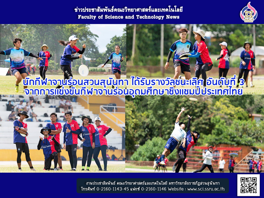 เมื่อวันเสาร์ที่ 29 สิงหาคม 2563 ที่ผ่านมา นักศึกษาสาขาวิชาวิทยาศาสตร์การกีฬาเเละสุขภาพ คณะวิทยาศาสตร์และเทคโนโลยีมหาวิทยาลัยราชภัฏสวนสุนันทา เข้าร่วมการเเข่งขันกีฬาจานร่อนอุดมศึกษาชิงเเชมป์ประเทศไทย สนามที่ 3 ณ มหาวิทยาลัยราชภัฏหมู่บ้านจอมบึง จังหวัดราชบุรี ผลการเเข่งขันทีมมหาวิทยาลัยราชภัฏสวนสุนันทา รอบเเรก เกมที่ 1 ชนะทีมมหาวิทยาลัยเกษตรศาสตร์ 6-4 เกมที่ 2 เเพ้ทีมมหาวิทยาลัยราชภัฏกาญจนบุรี 7-5 รอบสอง ชนะทีมมหาวิทยาลัยราชภัฏหมู่บ้านจอมบึง 8-3 เเละรอบรองชนะเลิศ เเพ้ทีมมหาวิทยาลัยการกีฬาเเห่งชาติวิทยาเขตสุพรรณบุรี 5-6 ทั้งนี้ ทีมนักกีฬาจานร่อนสวนสุนันทาได้รับรางวัลชนะเลิศ อันดับที่ 3 ของการเเข่งขันจานร่อนอุดมศึกษาชิงเเชมป์ประเทศไทย สนามที่ 3