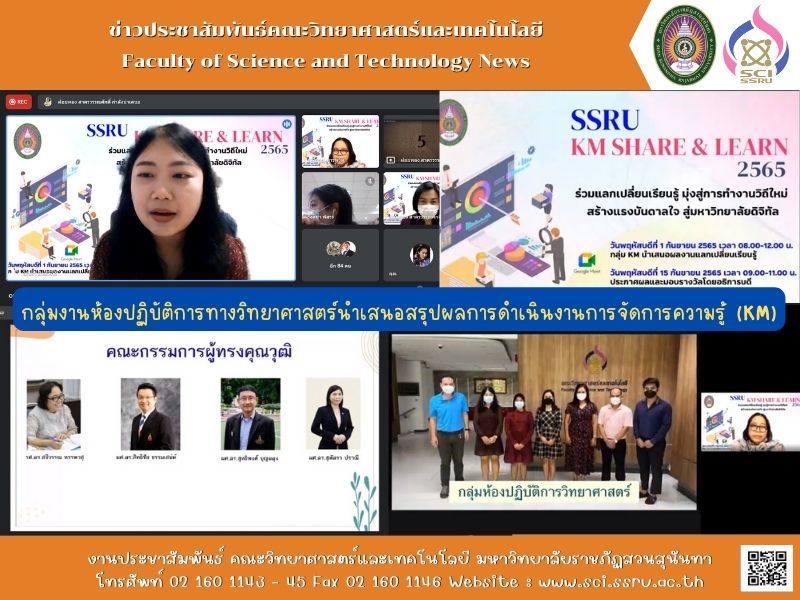 เมื่อวันพฤหัสบดีที่ 1 กันยายน 2565 บุคลากรของคณะวิทยาศาสตร์และเทคโนโลยีเข้าร่วมกิจกรรมนำเสนอผลงานกลุ่ม KM ประจำปีงบประมาณ พ.ศ.2565 ในรูปแบบออนไลน์ ผ่าน Google Meet โดยมี นางสาววรากร โฉมโสภา เป็นตัวแทนกลุ่มงานห้องปฏิบัติการทางวิทยาศาสตร์นำเสนอสรุปผลการดำเนินงานการจัดการความรู้ (KM) ให้กับคณะกรรมการผู้ทรงคุณวุฒิทั้ง 4 ท่าน ได้แก่ 1) รศ.ดร.สจีวรรณ ทรรพวสุ 2) ผศ.ดร.สิทธิชัย ธรรมเสน่ห์ 3) ผศ.ดร.สุทธิพงศ์ บุญผดุง และ 4) ผศ.ดร.สุพัตรา ปราณี เข้าร่วมรับฟังการนำเสนอผลการดำเนินงานจากทุกกลุ่ม