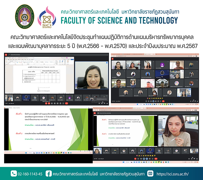 เมื่อวันพุธที่ 1 พฤศจิกายน 2566 คณะวิทยาศาสตร์และเทคโนโลยี จัดประชุมทำแผนปฏิบัติการด้านแผนบริหารทรัพยากรบุคคล และ แผนพัฒนาบุคลากรระยะ 5 ปี (พ.ศ.2566 - พ.ศ.2570) และประจำปีงบประมาณ พ.ศ.2567 และการบริหารจัดการเครื่องมือวิทยาศาสตร์ โดยมี ผู้ช่วยศาสตราจารย์ ดร.ฒาลิศา เนียมมณี รองคณบดีฝ่ายบริหาร ประธานการประชุม พร้อมด้วย หัวหน้าสาขาวิชา หัวหน้าแขนงวิชา หัวหน้าสำนักงาน และเจ้าหน้าที่ที่เกี่ยวข้อง จัดประชุมในรูปแบบ Online ผ่านระบบ Google Meet