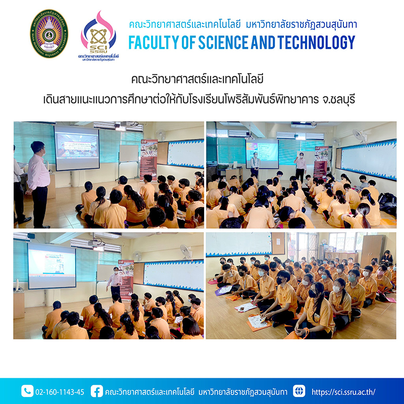 เมื่อวันพฤหัสบดีที่ 1 ธันวาคม 2565 นำโดย รองศาสตราจารย์ ดร.ชัยศรี ธาราสวัสดิ์พิพัฒน์ คณบดีคณะวิทยาศาสตร์และเทคโนโลยี และบุคลากรสายสนับสนุนวิชาการมาให้ความรู้จัดแนะแนวการศึกษาต่อให้กับนักเรียนมัธยมศึกษาตอนปลาย (ม.6) ณ ห้องแนะแนว อาคาร 5 ชั้น 2 โรงเรียนโพธิสัมพันธ์พิทยาคาร เขตเมืองพัทยา จังหวัดชลบุรี