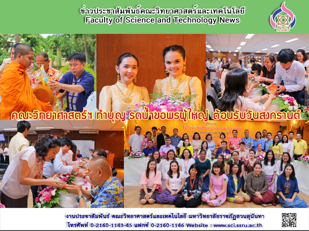 วันที่ 2 เมษายน 2562 ฝ่ายกิจการนักศึกษาและศิลปวัฒนธรรม คณะวิทยาศาสตร์และเทคโนโลยี จัดโครงการสืบสานประเพณีสงกรานต์ รดน้ำขอพรผู้ใหญ่ ณ ห้องประชุมใหญ่ 26103 เวลา 07.00 – 11.00 น. ซึ่งในช่วงเช้าเป็นพิธีถวายภัตตาหารเช้าแด่พระภิกษุสงฆ์ ถวายเครื่องสังฆทาน และตักบาตรอาหารแห้ง โดย ผู้ช่วยศาสตราจารย์ ดร.อาณัติ ต๊ะปินตา คณบดีคณะวิทยาศาสตร์และเทคโนโลยี เป็นประธานในพิธี หลังจากนั้นเป็นพิธีรดน้ำขอพรคณาจารย์ผู้ใหญ่ของคณะฯ