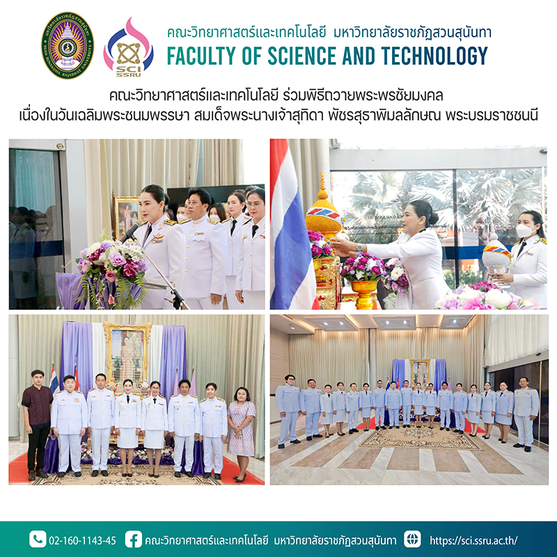 วันที่ 2 มิถุนายน 2566 คณะวิทยาศาสตร์และเทคโนโลยี นำโดย รองศาสตราจารย์ ดร.ชัยศรี ธาราสวัสดิ์พิพัฒน์ คณบดีคณะวิทยาศาสตร์และเทคโนโลยี พร้อมด้วย รองศาสตราจารย์ ดร.ณรงค์ สังวาระนที รองคณบดีฝ่ายวิจัยและบริการวิชาการ และ นางสาวกมลทิพย์ สัตบุษ หัวหน้าสำนักงานคณบดี เข้าร่วมร่วมพิธีถวายพระพรชัยมงคล เนื่องในวันเฉลิมพระชนมพรรษา สมเด็จพระนางเจ้าสุทิดา พัชรสุธาพิมลลักษณ พระบรมราชชนนี วันเสาร์ที่ 3 มิถุนายน 2566 โดยมี รองศาสตรจารย์ ดร.ชุติกาญจน์ ศรีวิบูลย์ อธิการบดีมหาวิทยาลัยราชภัฏสวนสุนันทา เป็นประธานในพิธี ณ หอเกียรติยศ (Hall Of Fame) ชั้น 1 อาคารสำนักงานอธิการบดี มหาวิทยาลัยราชภัฏสวนสุนันทา