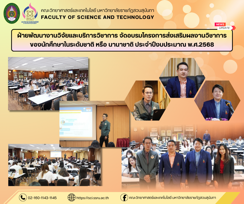 วันอังคารที่ 2 กันยายน พ.ศ.2568 ฝ่ายพัฒนางานวิจัยและบริการวิชาการ ได้จัดอบรมโครงการส่งเสริมผลงานวิชาการของนักศึกษาในระดับชาติ หรือ นานาชาติ ประจำปีงบประมาณ พ.ศ.2568 ให้กับนักศึกษา ชั้นปีที่ 3 - 4 คณะวิทยาศาสตร์และเทคโนโลยี มหาวิทยาลัยราชภัฏสวนสุนันทา โดยมี ผู้ช่วยศาสตราจารย์ ดร.ชินวัฒน์ ศาสนนันทน์ คณบดีคณะวิทยาศาสตร์และเทคโนโลยี เป็นประธานกล่าวเปิดงาน พร้อมด้วย ผู้ช่วยศาสตราจารย์ ดร.โสพิศ สว่างจิตร รองคณบดีฝ่ายวิจัยและบริการวิชาการ กล่าวรายงานและความสำคัญของโครงการ โดยกิจกรรมในครั้งนี้ ได้รับเกียรติจาก อาจารย์ ดร.สธน ผ่องอำไพ จากหน่วยงาน สถาบันเทคโนโลยีพระจอมเกล้าคุณทหารลาดกระบัง มาเป็นวิทยากรบรรยายให้ความรู้กับนักศึกษา ในหัวข้อเรื่อง การเลือกหัวข้อวิจัย เทคนิคการเขียนบทความทางวิชาการ การนำเสนอบทความวิชาการบนเวทีงานประชุมวิชาการ การสร้างสรรค์ผลงานและเผยแพร่ผลงานวิชาการ กิจกรรมดังกล่าว สอดคล้องกับเป้าหมายการพัฒนาที่ยั่งยืน (Sustainable Development Goals: SDGs) โดยเฉพาะ SDG 4 สร้างหลักประกันว่าทุกคนมีการศึกษาที่มีคุณภาพอย่างครอบคลุมและเท่าเทียม และสนับสนุนโอกาสในการเรียนรู้ตลอดชีวิต เช่น การให้นักศึกษาได้ศึกษาผ่านการเรียนรู้ด้วยตนเอง SDG 9 การพัฒนาโครงสร้างพื้นฐานที่แข็งแกร่ง การวิจัยและพัฒนาทางวิทยาศาสตร์ สนับสนุนทางเทคโนโลยี และขับเคลื่อนการเติบโตทางเศรษฐกิจและสังคม โดยจัดขึ้น ณ ห้องประชุม 26103 อาคาร 26 คณะวิทยาศาสตร์และเทคโนโลยี มหาวิทยาลัยราชภัฏสวนสุนันทา