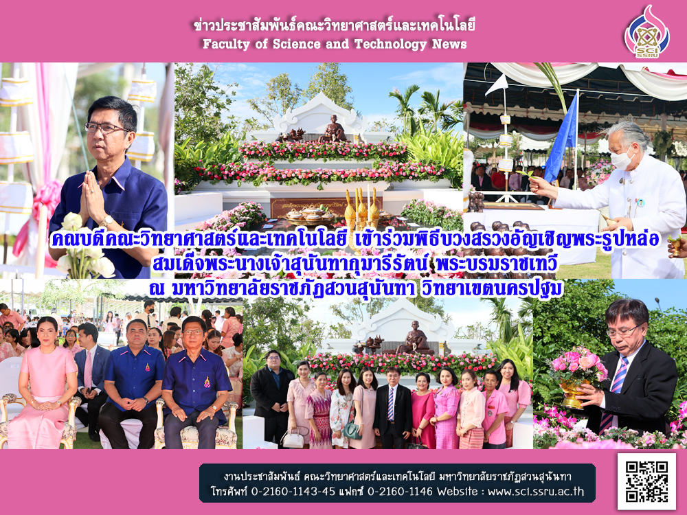 วันพฤหัสบดี ที่ 3 ธันวาคม 2563 ผู้ช่วยศาสตราจารย์ ดร.อาณัติ ต๊ะปินตา คณบดีคณะวิทยาศาสตร์และเทคโนโลยี พร้อมด้วยบุคลากร เข้าร่วมพิธีบวงสรวงอัญเชิญพระรูปหล่อสมเด็จพระนางเจ้าสุนันทากุมารีรัตน์ พระบรมราชเทวี ประดิษฐาน ณ ลานหน้าพระราชานุสาวรีย์สมเด็จพระนางเจ้าสุนันทากุมารีรัตน์ พระบรมราชเทวี มหาวิทยาลัยราชภัฏสวนสุนันทา วิทยาเขตนครปฐม โดยมีรองศาสตราจารย์ ดร.ฤๅเดช เกิดวิชัย นายกสภามหาวิทยาลัย เป็นประธานในพิธี พร้อมด้วย รองศาสตราจารย์ ดร.ชุติกาญจน์ ศรีวิบูลย์ รักษาราชการแทนอธิการบดี คณะผู้บริหารของมหาวิทยาลัย อาจารย์ บุคลากร และนักศึกษาเข้าร่วมพิธี