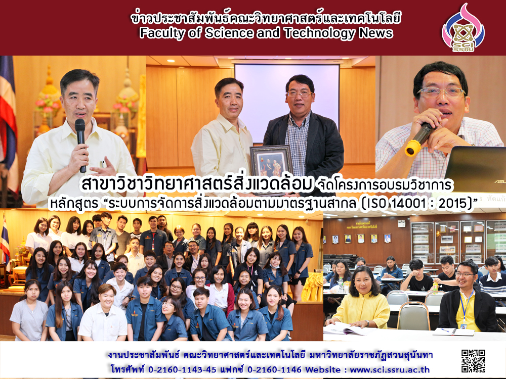 วันที่ 3 – 4 เมษายน 2562 สาขาวิชาวิทยาศาสตร์สิ่งแวดล้อม คณะวิทยาศาสตร์และเทคโนโลยี มหาวิทยาลัยราชภัฏสวนสุนันทา จัดโครงการอบรมวิชาการ ให้กับนักศึกษาชั้นปีที่ 4 สาขาวิทยาศาสตร์สิ่งแวดล้อม โดย ได้รับเกียรติจาก คุณสุนทร ทัดแก้ว (กรรมการผู้จัดการและ Lead Auditor ตรวจให้การรับรองมาตรฐานและตรวจติตามระบบ) จากบริษัท คิวอีแอนด์อี แมนเนจเม้นท์ จำกัด (QEANDE MANAGEMENT CO.,LTD) ซึ่งในวันที่ 3 เมษายน 2562 เป็นการอบรมในหัวข้อ “ข้อกำหนดระบบการจัดการสิ่งแวดล้อม (Environmental Management system) และในวันที่ 4 เมษายน 2562 อบรมในหัวข้อ “การตรวจประเมินระบบการจัดการสิ่งแวดล้อม (Environmental Auditing) ทั้งนี้มีนักศึกษาเข้าอบรมจำนวนทั้งสิ้น 44 คน