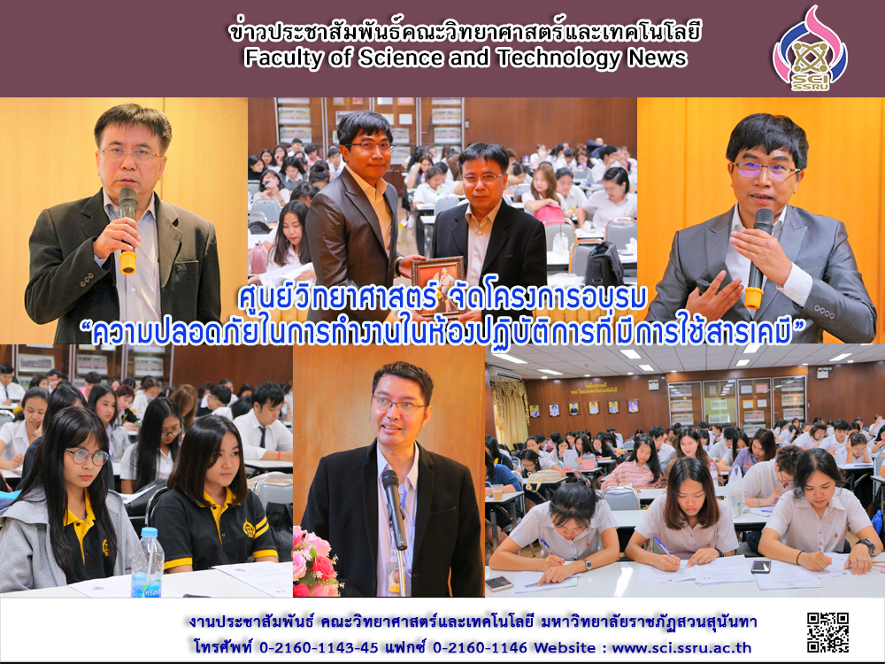 วันที่ 5 เมษายน 2562 ศูนย์วิทยาศาสตร์ คณะวิทยาศาสตร์และเทคโนโลยี มหาวิทยาลัยราชภัฏสวนสุนันทา จัดโครงการอบรม หลักสูตร “ความปลอดภัยในการทำงานในห้องปฏิบัติการที่มีการใช้สารเคมี” โดย ผู้ช่วยศาสตราจารย์ ดร.อาณัติ ต๊ะปินตา คณบดีคณะวิทยาศาสตร์ฯ เป็นประธานในการเปิดงาน ทั้งนี้ได้รับเกียรติจาก ดร.องอาจ ธเนศนิตย์ ผู้เชี่ยวชาญในการจัดการความปลอดภัยในห้องปฏิบัติการ จากศูนย์ความปลอดภัยอาชีวอนามัยและสิ่งแวดล้อม จุฬาลงกรณ์มหาวิทยาลัย มาเป็นวิทยากรบรรยาย ซึ่งการอบรมในครั้งนี้มีจำนวนผู้เข้าอบรมทั้งสิ้น 163 คน ประกอบด้วย อาจารย์ นักวิทยาศาสตร์ และนักศึกษาจากสาขาวิชาวิทยาศาสตร์สิ่งแวดล้อม สาขาวิชาเคมี สาขาวิชาชีววิทยา สาขาวิชาวิทยาศาสตร์และเทคโนโลยีการอาหาร สาขานิติวิทยาศาสตร์ และสาขาวิชาจุลชีววิทยา
