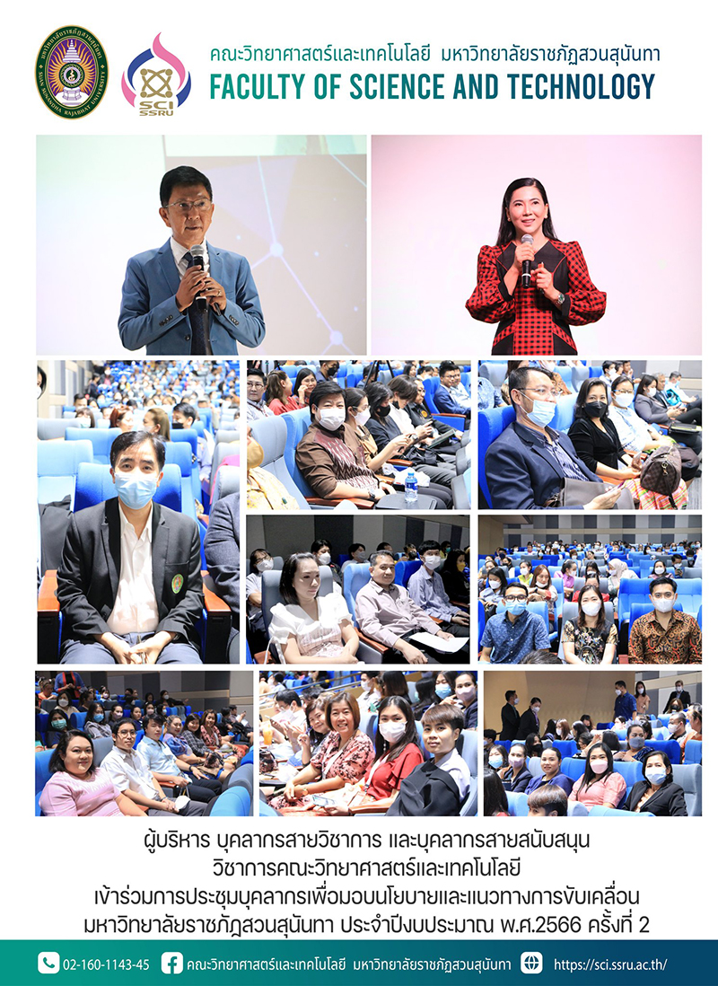 ผู้บริหาร บุคลากรสายวิชาการ และบุคลากรสายสนับสนุนวิชาการคณะวิทยาศาสตร์และเทคโนโลยีเข้าร่วมการประชุมบุคลากรเพื่อมอบนโยบายและแนวทางการขับเคลื่อนมหาวิทยาลัยราชภัฏสวนสุนันทา ประจำปีงบประมาณ พ.ศ.2566 ครั้งที่ 2