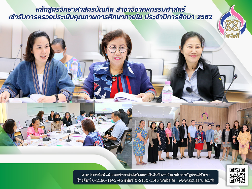 วันที่ 7 สิงหาคม 2563 ณ ห้องประชุม 26109 ชั้น 1 อาคารคณะวิทยาศาสตร์และเทคโนโลยี หลักสูตรวิทยาศาสตรบัณฑิต สาขาวิชาคหกรรมศาสตร์ คณะวิทยาศาสตร์และเทคโนโลยี เข้ารับการตรวจประเมินคุณภาพการศึกษาภายใน ประจำปีการศึกษา 2562 โดยได้รับเกียรติจากผู้ทรงคุณวุฒิจากภายนอก จำนวน 3 ท่าน ได้แก่ รองศาสตราจารย์บุษรา สร้อยระย้า (ประธานกรรมการ) ผู้ช่วยศาสตราจารย์ศรัทธา แข่งเพ็ญแข (กรรมการ) รองศาสตราจารย์ ดร.ฤดี นิยมรัตน์ (กรรมการ) และ นางสาวรดาศา โพธิ์จาด (เลขานุการ) ทั้งนี้ เป็นการประเมินผลการดำเนินงานของหลักสูตรตามรอบปีการศึกษา 2562 เพื่อนำผลการประเมินที่ได้รับมาพัฒนาหลักสูตรสาขาวิชาต่อไป