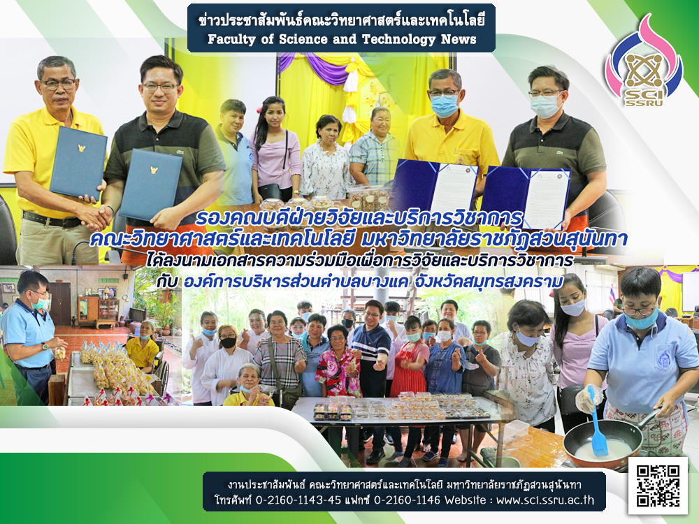 เมื่อวันที่ 24 กรกฎาคม 2563 อาจารย์ ดร.วัฒนา พันธุ์พืช รองคณบดีฝ่ายวิจัยและบริการวิชาการ คณะวิทยาศาสตร์และเทคโนโลยี มหาวิทยาลัยราชภัฏสวนสุนันทา ได้ลงนามเอกสารความร่วมมือเพื่อการวิจัยและบริการวิชาการ กับ องค์การบริหารส่วนตำบลบางแค จังหวัดสมุทรสงคราม เพื่อดำเนินการวิจัย บริการวิชาการ และถ่ายทอดนวัตกรรมเทคโนโลยีสู่ชุมชนให้เกิดผลสัมฤทธิ์อย่างเป็นรูปธรรม ในการส่งเสริมและสนับสนุนให้คณาจารย์ บุคลากร หน่วยงานมีส่วนร่วม และสร้างองค์ความรู้ด้วยกระบวนการวิจัยและบริการวิชาการ เพื่อนำไปบูรณาการการเรียนการสอน พัฒนาท้องถิ่น ถ่ายทอดเทคโนโลยี และสร้างองค์ความรู้ใหม่เพื่อพัฒนาคุณภาพชีวิต ท้องถิ่น และสร้างความเข้มแข็งของชุมชน ภายใต้ชื่อ โครงการบริการวิชาการตามยุทธศาสตร์มหาวิทยาลัยราชภัฏเพื่อการพัฒนาท้องถิ่น ประจำปีงบประมาณ พ.ศ. 2563 “ เสริมอาชีพ สร้างรายได้ โดยใช้วัตถุดิบเอกลักษณ์พื้นถิ่นของชุมชนอัมพวา ”