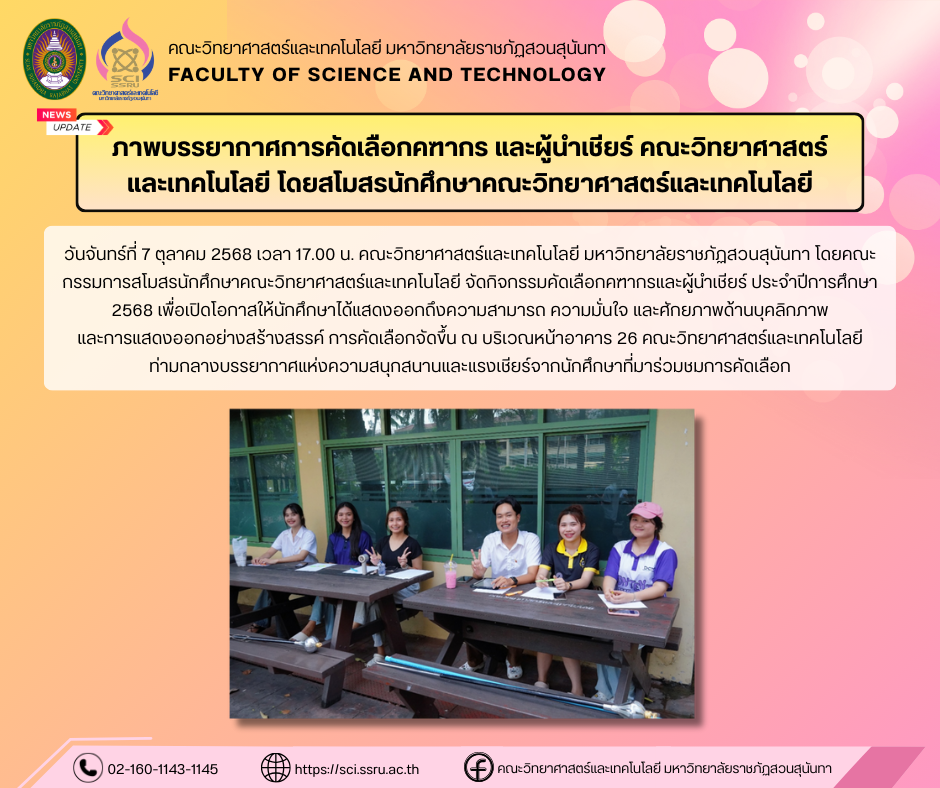 วันจันทร์ที่ 7 ตุลาคม 2568 เวลา 17.00 น. คณะวิทยาศาสตร์และเทคโนโลยี มหาวิทยาลัยราชภัฏสวนสุนันทา โดยคณะกรรมการสโมสรนักศึกษาคณะวิทยาศาสตร์และเทคโนโลยี จัดกิจกรรมคัดเลือกคฑากรและผู้นำเชียร์ ประจำปีการศึกษา 2568 เพื่อเปิดโอกาสให้นักศึกษาได้แสดงออกถึงความสามารถ ความมั่นใจ และศักยภาพด้านบุคลิกภาพ และการแสดงออกอย่างสร้างสรรค์ การคัดเลือกจัดขึ้น ณ บริเวณหน้าอาคาร 26 คณะวิทยาศาสตร์และเทคโนโลยี ท่ามกลางบรรยากาศแห่งความสนุกสนานและแรงเชียร์จากนักศึกษาที่มาร่วมชมการคัดเลือก