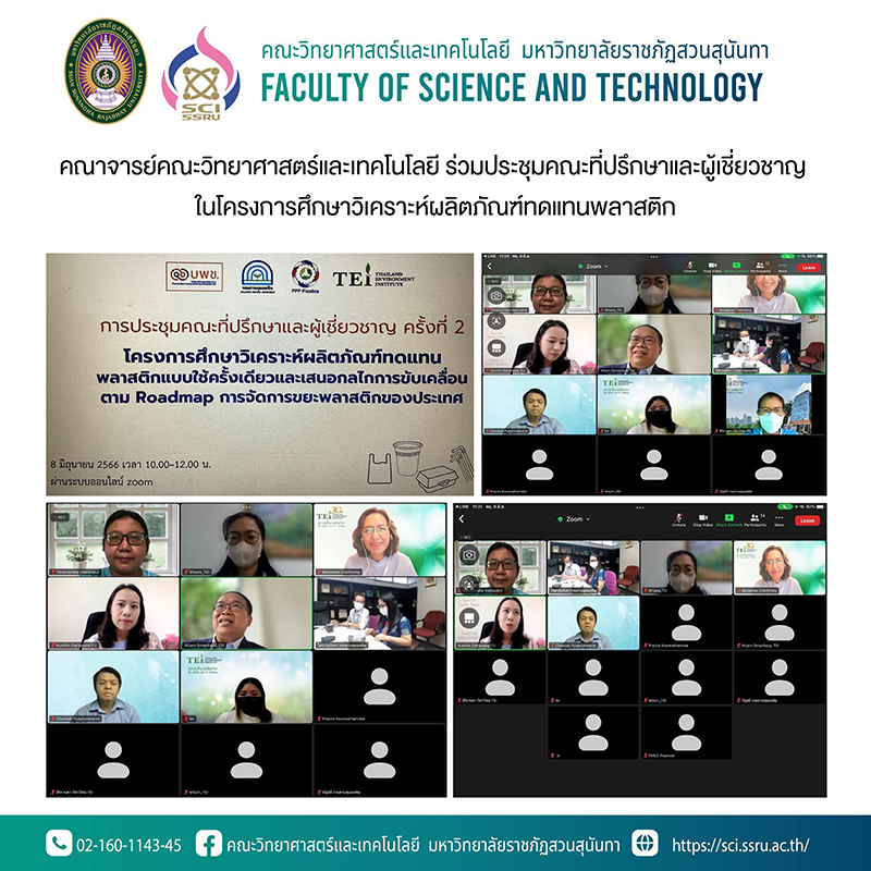 เมื่อวันที่ 8 มิถุนายน 2566 ผศ.ดร.ทัศนาวลัย อุฑารสกุล และ อาจารย์ ดร.ชูเกียรติ ผุดพรหมราช อาจารย์ประจำคณะวิทยาศาสตร์และเทคโนโลยี มหาวิทยาลัยราชภัฏสวนสุนันทาได้ร่วมประชุมคณะที่ปรึกษาและผู้เชี่ยวชาญ ในโครงการศึกษาวิเคราะห์ผลิตภัณฑ์ทดแทนพลาสติกแบบใช้ครั้งเดียวและเสนอกลไกการขับเคลื่อนตาม Roadmap การจัดการขยะพลาสติกของประเทศ ร่วมกับสถาบันสิ่งแวดล้อมไทยและกรมควบคุมมลพิษ ผ่านระบบออนไลน์ Zoom