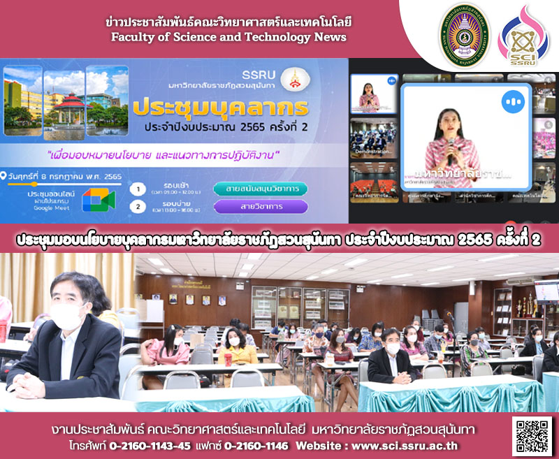 วันศุกร์ที่ 8 กรกฎาคม 2565 เวลา 09.00-12.00น. คณบดี พร้อมด้วยบุคลากรสายสนับสนุนวิชาการคณะวิทยาศาสตร์และเทคโนโลยี เข้าร่วมการประชุมมอบนโยบายบุคลากร มหาวิทยาลัยราชภัฏสวนสุนันทา ประจำปีงบประมาณ 2565 ครั้งที่ 2 (ในรูปแบบออนไลน์) โดยบุคลากรร่วมรับฟัง ณ ห้องประชุม 26103 คณะวิทยาศาสตร์และเทคโนโลยี