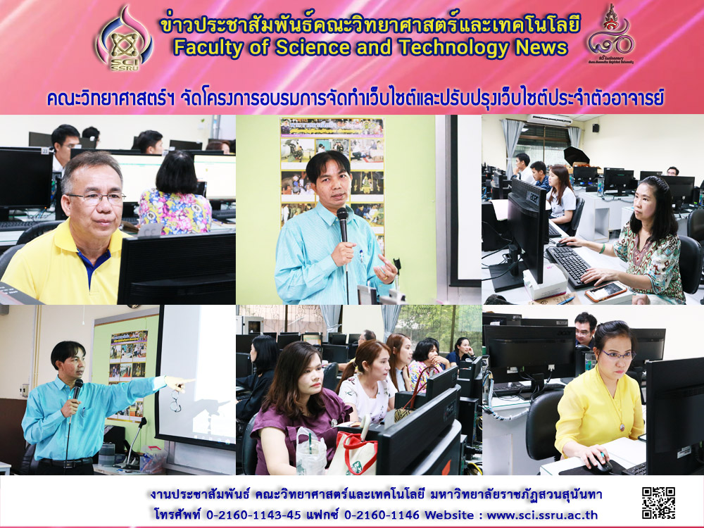วันที่ 8 สิงหาคม 2561 คณะวิทยาศาสตร์และเทคโนโลยี จัดโครงการอบรมการจัดทำเว็บไซต์และปรับปรุงเว็บไซต์ประจำตัวอาจารย์ ณ ห้องปฏิบัติการทางสถิติ อาคาร 26 ชั้น 2 คณะวิทยาศาสตร์และเทคโนโลยี โดย อาจารย์เสถียร จันทร์ปลา อาจารย์ประจำสาขาวิชาวิทยาการคอมพิวเตอร์ เป็นผู้อบรม ทั้งนี้โครงการมีการดำเนินโครงการ ในระหว่างวันที่ 8-9 สิงหาคม 2561 ทั้งนี้เพื่ออบรมแนวทางในการจัดทำเว็บไซต์ประจำตัวสำหรับอาจารย์ใหม่ และเพื่อแนะแนวทางในการแก้ไขและปรับปรุงเว็บไซต์ของคณาจารย์ให้มีการพัฒนาและเป็นปัจจุบันมากยิ่งขึ้น