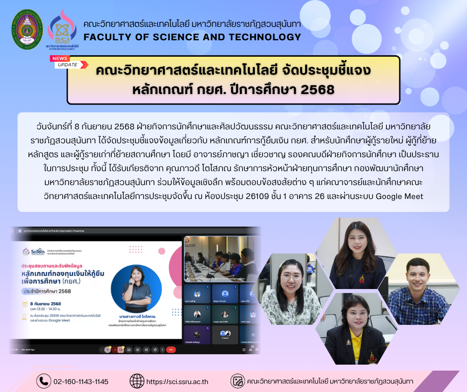 วันที่ 8 กันยายน 2568 ฝ่ายกิจการนักศึกษาและศิลปวัฒนธรรม คณะวิทยาศาสตร์และเทคโนโลยี มหาวิทยาลัยราชภัฏสวนสุนันทา ได้จัดประชุมชี้แจงข้อมูลเกี่ยวกับ หลักเกณฑ์การกู้ยืมเงิน กยศ. สำหรับนักศึกษาผู้กู้รายใหม่ ผู้กู้ที่ย้ายหลักสูตร และผู้กู้รายเก่าที่ย้ายสถานศึกษา โดยมี อาจารย์ภาชญา เชี่ยวชาญ รองคณบดีฝ่ายกิจการนักศึกษา เป็นประธานในการประชุม ทั้งนี้ ได้รับเกียรติจาก คุณภาวดี โตโสภณ รักษาการหัวหน้าฝ่ายทุนการศึกษา กองพัฒนานักศึกษา มหาวิทยาลัยราชภัฏสวนสุนันทา ร่วมให้ข้อมูลเชิงลึก พร้อมตอบข้อสงสัยต่าง ๆ แก่คณาจารย์และนักศึกษาคณะวิทยาศาสตร์และเทคโนโลยี การประชุมจัดขึ้น ณ ห้องประชุม 26109 ชั้น 1 อาคาร 26 คณะวิทยาศาสตร์และเทคโนโลยี และผ่านระบบ Google Meet