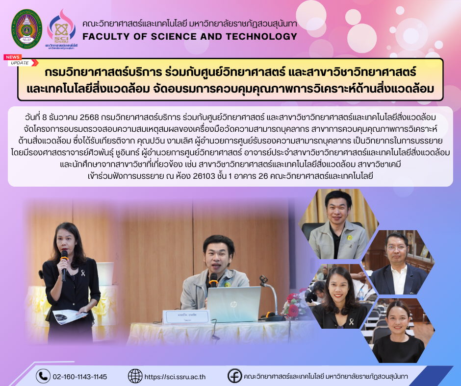 > กรมวิทยาศาสตร์บริการ ร่วมกับศูนย์วิทยาศาสตร์ และสาขาวิชาวิทยาศาสตร์ และเทคโนโลยีสิ่งแวดล้อม จัดอบรมการควบคุมคุณภาพการวิเคราะห์ด้านสิ่งแวดล้อม