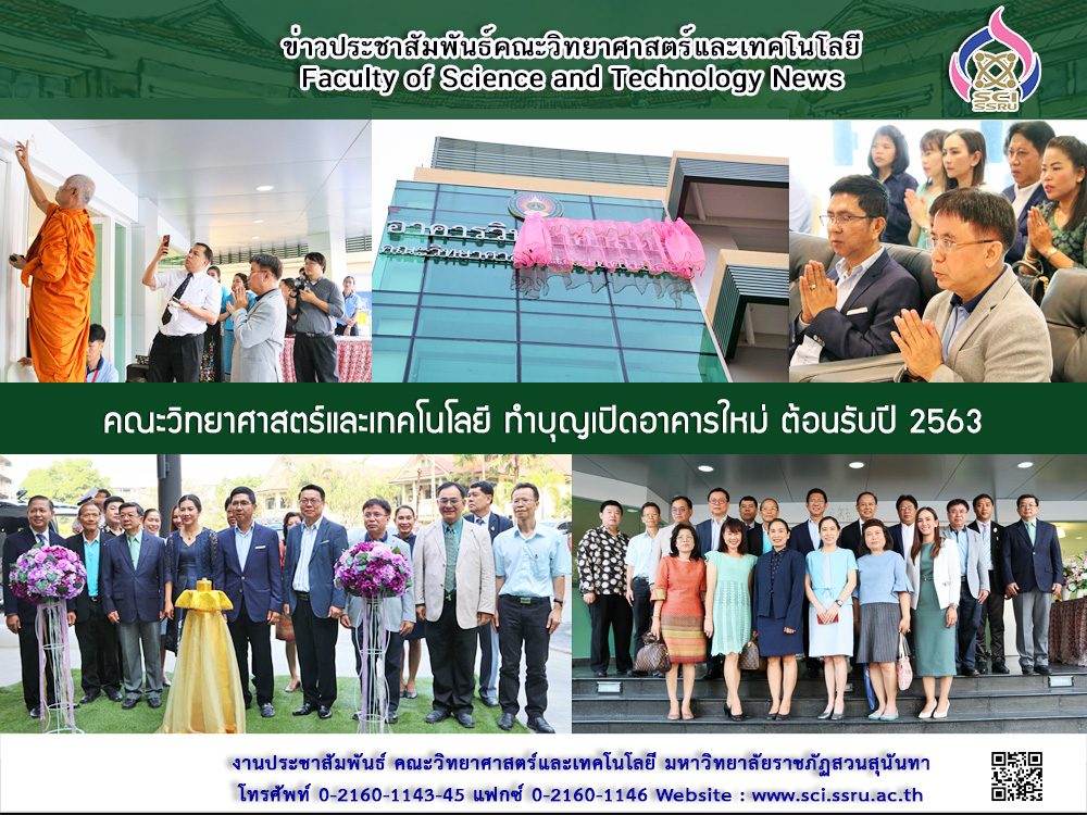 เช้าวันพุธที่ 8 มกราคม 2563 ณ ห้องโถงชั้น 1 อาคาร 23 คณะวิทยาศาสตร์และเทคโนโลยี ผู้บริหาร คณาจารย์และเจ้าหน้าที่ คณะวิทยาศาสตร์และเทคโนโลยี ร่วมต้อนรับ ทีมผู้บริหารมหาวิทยาลัย นำโดย รองศาสตราจารย์ ดร.ฤๅเดช เกิดวิชัย อธิการบดีมหาวิทยาลัยราชภัฏสวนสุนันทา พร้อมด้วยทีมผู้บริหาร เข้าร่วมพิธีทำบุญเปิดอาคารวิทยาศาสตร์ (อาคาร 23) ทั้งนี้ในช่วงแรกเป็นพิธีสงฆ์ เพื่อเป็นสิริมงคลในการเปิดใช้พื้นที่ของอาคารใหม่ และปิดท้ายด้วยการร่วมพิธีเปิดป้ายอาคาร โดยบรรยากาศเป็นไปอย่างราบรื่น