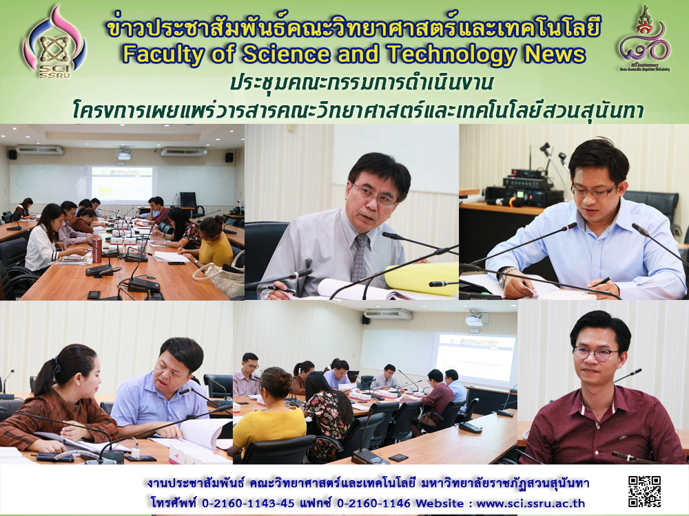 วันที่ 9 เมษายน 2561 คณะวิทยาศาสตร์และเทคโนโลยี โดย ผู้ช่วยศาสตราจารย์ ดร.อาณัติ ต๊ะปินตา คณบดีคณะวิทยาศาสตร์และเทคโนโลยี เป็นประธานในการประชุมคณะกรรมการดำเนินงานโครงการเผยแพร่วารสารคณะวิทยาศาสตร์และเทคโนโลยีสวนสุนันทา ฉบับเดือนมกราคม และเดือนกรกฎาคม 2561 ครั้งที่ 3/2561 พร้อมด้วยคณะกรรมการดำเนินงาน โดยมีเรื่องสืบเนื่อง ดังนี้ การจัดทำรูปเล่มวารสารวิทยาศาสตร์และเทคโนโลยีสวนสุนันทา ประจำเดือนกรกฎาคม 2560 (Vol.4 No.2,July 2017) เดือนมกราคม 2561 (Vol.5 No.1,Jan 2018) และเดือนกรกฎาคม 2561 (Vol.5 No.2, July 2018) และเรื่องเสนอเพื่อพิจารณา ดังนี้ แผนผังการพิจารณาบทความวารสารวิทยาศาสตร์และเทคโนโลยีสวนสุนันทา การปรับปรุงรูปแบบหน้าปกและขนาดของรูปเล่มวารสารวิทยาศาสตร์และเทคโนโลยีสวนสุนัน และหนังสือรับรองการตีพิมพ์บทความ