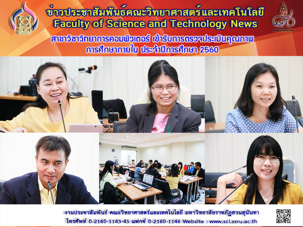 วันที่ 9 กรกฎาคม 2561 หลักสูตรวิทยาศาสตรบัณฑิต สาขาวิชาวิทยาการคอมพิวเตอร์ เข้ารับการตรวจประเมินคุณภาพการศึกษาภายใน ประจำปีการศึกษา 2560 โดยได้รับเกียรติจากผู้ทรงคุณวุฒิจากภายนอกมหาวิทยาลัย จำนวน 3 ท่าน นำโดย อาจารย์ ดร.สมคิด สุทธิธารธวัช จากมหาวิทยาลัยราชภัฏพระนคร (ประธานกรรมการ) อาจารย์ยุพิน พวกยะ จากมหาวิทยาลัยราชภัฏพระนครศรีอยุธยา (กรรมการ) ผู้ช่วยศาสตราจารย์ ศศิธร แก้วมั่น จากมหาวิทยาลัยมหาสารคาม (กรรมการ) และบุคลากรภายในมหาวิทยาลัย นางสาวพิลาวรรณ กองทองนอก (เลขานุการ) ทั้งนี้ เพื่อเป็นการประเมินผลการดำเนินงานของหลักสูตรตามรอบปีการศึกษา 2560 และนำผลการประเมินที่ได้มาพัฒนาหลักสูตรต่อไป