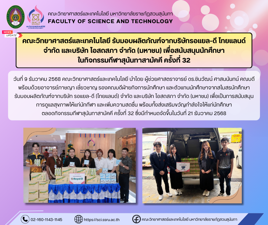 คณะวิทยาศาสตร์และเทคโนโลยี รับมอบผลิตภัณฑ์จากบริษัทรอแยล-ดี ไทยแลนด์ จำกัด และบริษัท โอสถสภา จำกัด (มหาชน) เพื่อสนับสนุนนักศึกษา ในกิจกรรมกีฬาสุนันทาสามัคคี ครั้งที่ 32