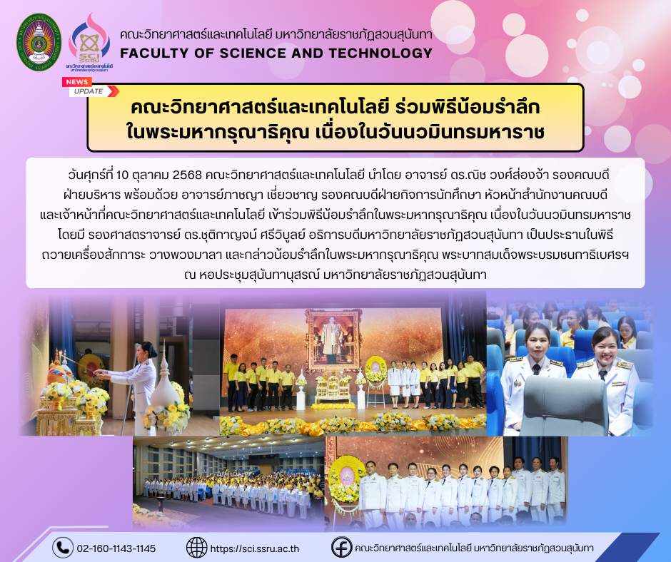 วันศุกร์ที่ 10 ตุลาคม 2568 คณะวิทยาศาสตร์และเทคโนโลยี นำโดย อาจารย์ ดร.ณิช วงศ์ส่องจ้า รองคณบดีฝ่ายบริหาร พร้อมด้วยอาจารย์ภาชญา เชี่ยวชาญ รองคณบดีฝ่ายกิจการนักศึกษา หัวหน้าสำนักงานคณบดี และเจ้าหน้าที่คณะวิทยาศาสตร์และเทคโนโลยี เข้าร่วมพิธีน้อมรำลึกในพระมหากรุณาธิคุณ เนื่องในวันนวมินทรมหาราช โดยมี รองศาสตราจารย์ ดร.ชุติกาญจน์ ศรีวิบูลย์ อธิการบดีมหาวิทยาลัยราชภัฏสวนสุนันทา เป็นประธานในพิธีถวายเครื่องสักการะ วางพวงมาลา และกล่าวน้อมรำลึกในพระมหากรุณาธิคุณ พระบาทสมเด็จพระบรมชนกาธิเบศรฯ ณ หอประชุมสุนันทานุสรณ์ มหาวิทยาลัยราชภัฏสวนสุนันทา