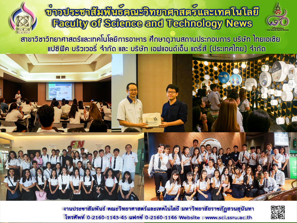 วันที่ 11 เมษายน พ.ศ. 2561 ที่ผ่านมา คณาจารย์สาขาวิชาวิทยาศาสตร์และเทคโนโลยีการอาหาร นำนักศึกษาเข้าเยี่ยมชมระบบการผลิตและการบรรจุผลิตภัณฑ์เครื่องดื่มแอลกอฮอล์ ณ บริษัท ไทยเอเชีย แปซิฟิค บริวเวอรี่ จำกัด (จังหวัดนนทบุรี) ซึ่งเป็นการผลิตอาหารจากกระบวนการหมัก ระบบการผลิตและการบรรจุผลิตภัณฑ์เครื่องดื่มนมแปรรูป ณ บริษัท เอฟแอนด์เอ็น แดรี่ส์ (ประเทศไทย) จำกัด (จังหวัดพระนครศรีอยุธยา) รวมทั้งระบบการสุขาภิบาลของโรงงานผลิตอาหาร ซึ่งเป็นหนึ่งในกิจกรรมการศึกษาเรียนรู้ภายนอกห้องเรียน ทั้งนี้เพื่อให้นักศึกษาได้รับประสบการณ์จริงจากสถานประกอบการ